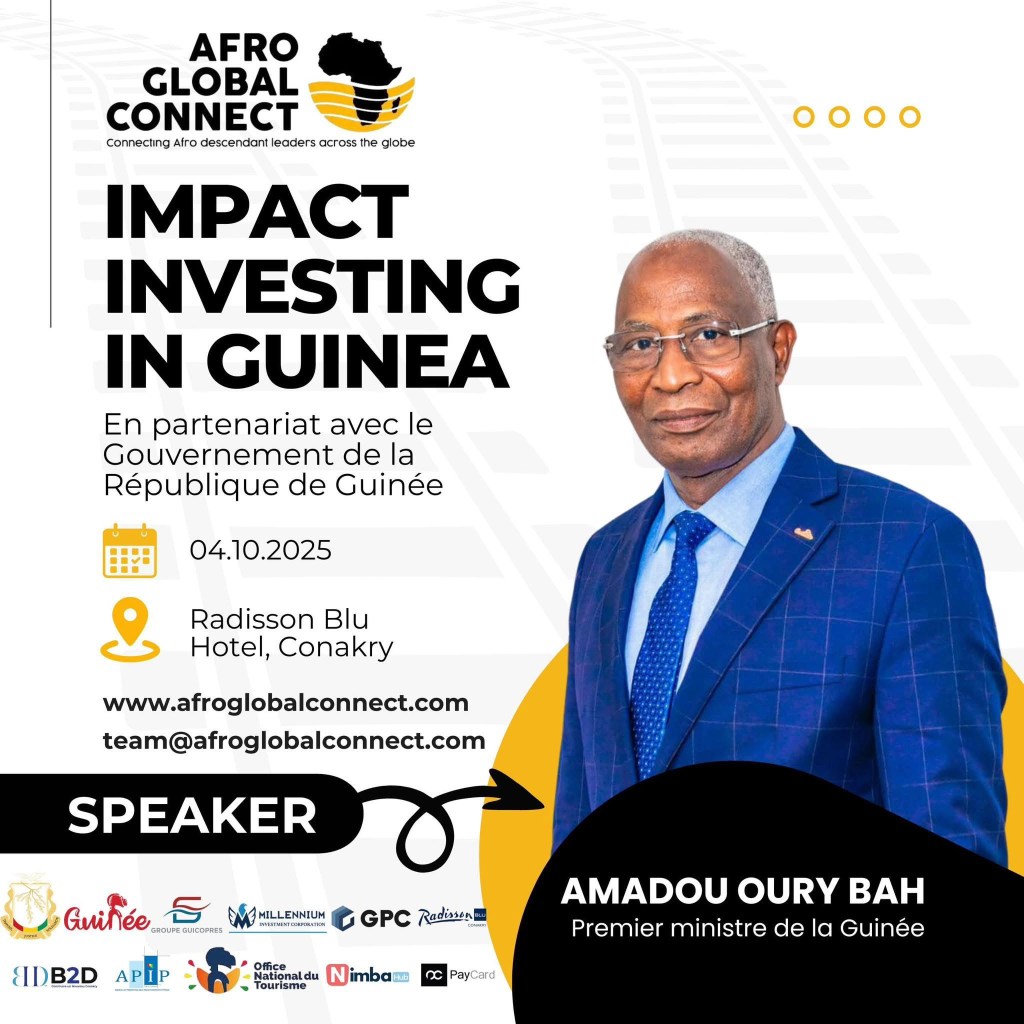 Conakry, 4 octobre 2025 – La capitale guinéenne accueillera le Forum Impact Investing in Guinea Afro Global Connect, organisé en partenariat avec le Gouvernement de la transition de la République de Guinée. L’événement se tiendra au Radisson Blu Hotel et réunira des investisseurs, décideurs politiques, entrepreneurs et membres de la diaspora africaine.