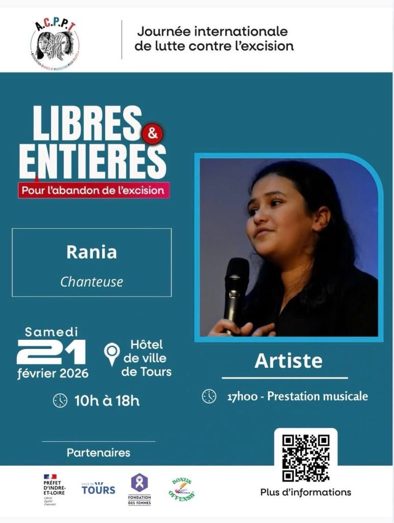 La journée se poursuivra à 17h00 avec une prestation musicale, valorisant la culture et la voix des femmes dans un cadre artistique et festif. L’artiste tourangelle Rania offrira un temps de rencontre artistique centré sur l’expression de l’intime et la transmission des expériences vécues. L’événement se conclura par un repas sur inscription, permettant aux participants de prolonger les échanges dans un cadre convivial.